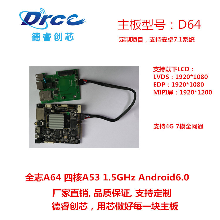 D64板卡是采用的全志A64方案,集成了多媒体解码、液晶驱动、HDMI、WIFI、蓝牙、以太网、3G/4G于一体,支持绝大部分当前流行的视频及图片格式解码,支持HDMI视频输出,LVDS双8路接口,EDP接口等,可以驱动各种TFT LCD显示屏,大大简化整机系统设计,SD卡,稳定性更强,非常适合于广告机、收银机、数字标牌、车载等智能终端主板。